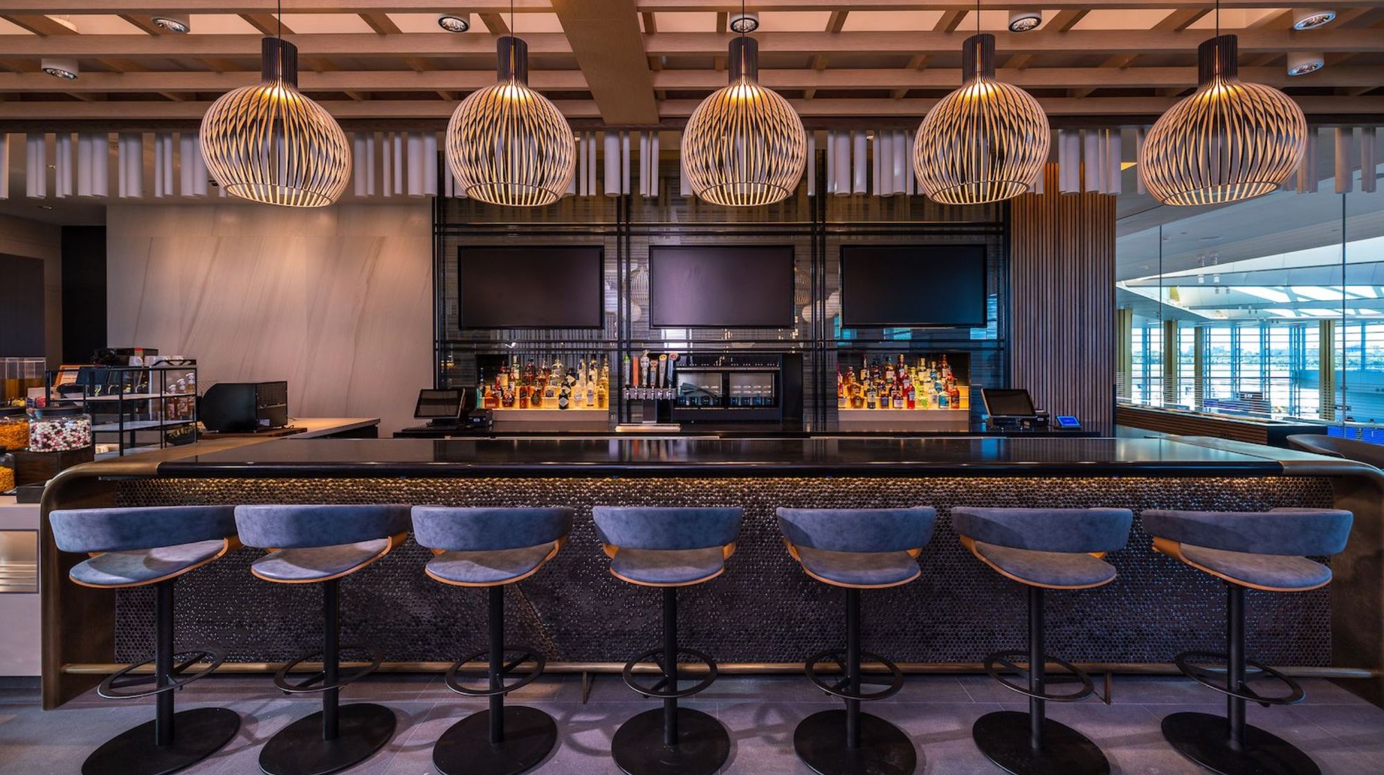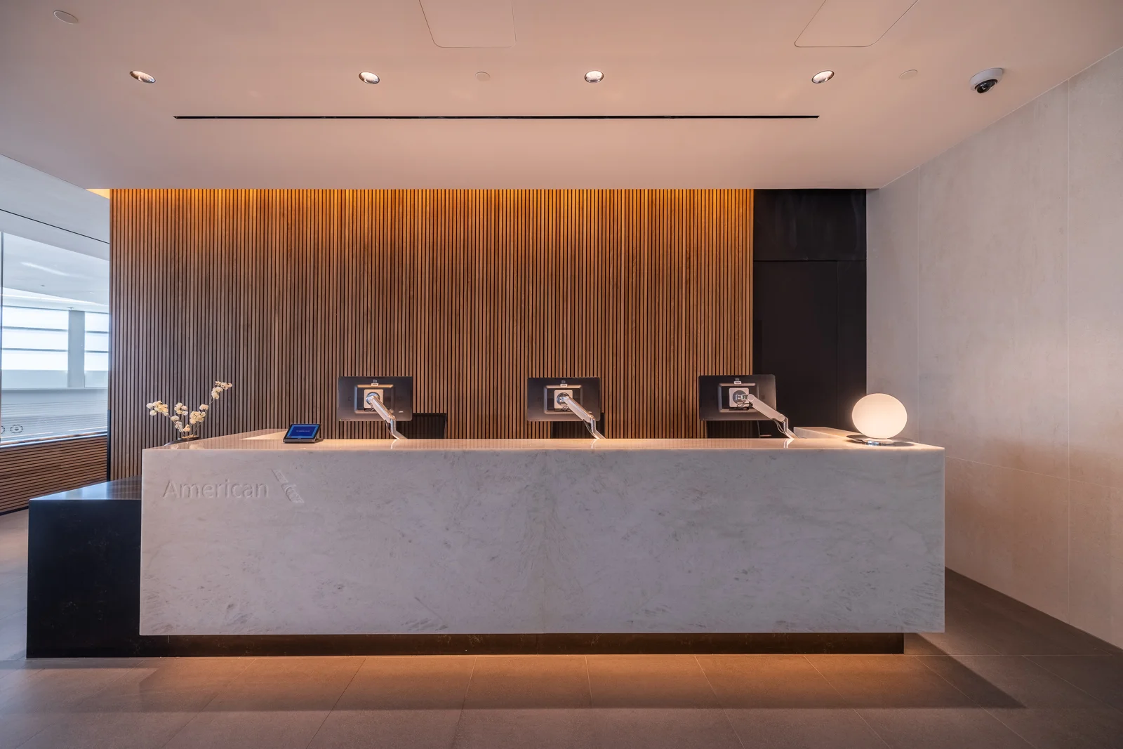 American Airlines has redefined the travel experience at Ronald Reagan Washington National Airport (DCA) with the stunning renovation of its Admirals Club lounge. This elevated space showcases American’s dedication to world-class hospitality, combining modern design with warm, refined materials to create a sophisticated retreat in the heart of the nation’s capital. HRSW contributed to the transformation with a highly customized reception desk featuring sandblasted and water-jetted marble, an executive bar, additional bar areas, and a large custom fireplace.