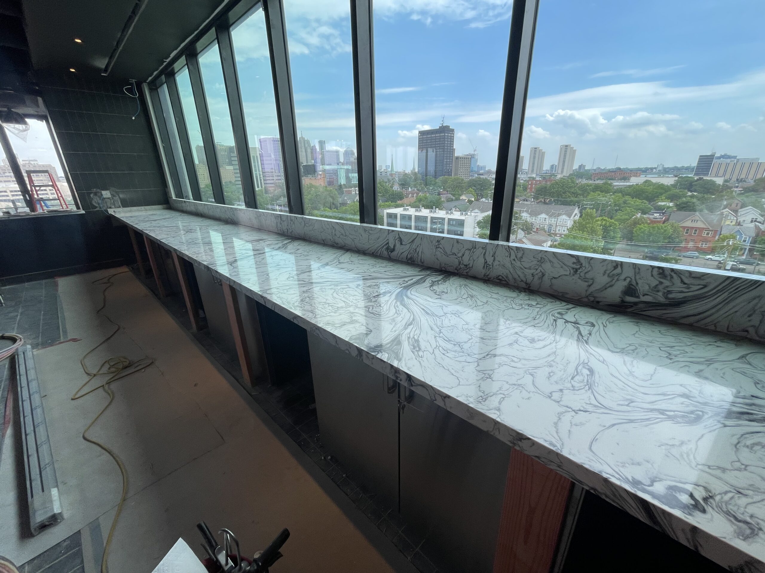The Godfrey Hotel Detroit, situated in the historic Corktown neighborhood, underwent a thoughtful construction and design process to blend modern luxury with the area’s rich heritage. A collaboration between Elkus Manfredi Architects and Neumann/Smith Architecture ensured the design honored Corktown’s historic character. HRSW contributed to the project by installing 14 varieties of quartz countertops across multiple public areas, including restrooms, boardrooms, bars, and the front desk.